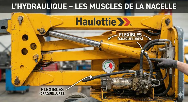 L’hydraulique est ce qui permet de lever des hommes à 20 mètres. Une défaillance ici est dangereuse et salissante (pollution sur chantier).